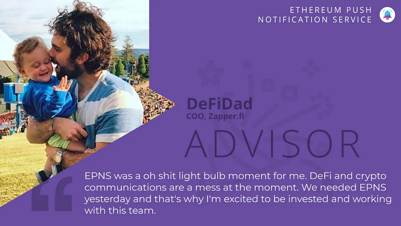 Ethereum Push Notification Service is beyond thrilled to announce that DeFi Legend DeFi Dad has joined the EPNS Advisory.